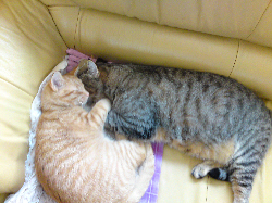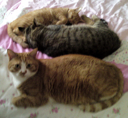 I received an update of Churchill with thanks to Erica. She wanted me to show how her sweet cats spend their weekend. The cats on her bed are Churchill, Mackenzie and Azraël. And on the bench - in a very relaxed position - is Churchill. Erica wrote me that they have such a hard life !!!!! Yeah right! I love to trade places if I could! Erica, thanks for the update and photos. And I see you soon! Again, get well soon!