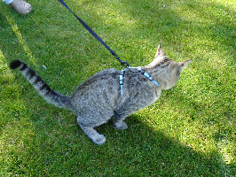 Hoi Linda, Hier even een berichtje over B&B. Het gaat goed met ze! Ze worden heel veel geknuffeld, ze zijn allebei heerlijk. Af en toe zijn ze ook erg ondeugend, zoals Bubbels vanmorgen. De tuindeur stond open en de hordeur dus dicht. Ik was een tijdje boven in huis bezig geweest en kwam beneden, maar had nog niks door. Een vriendin die hier was liet ik uit en terwijl we nog even bij de voordeur stonden te kletsen, zei zij ineens: Dat is toch niet jouw poes die daar in de tuin loopt? En ja hoor, Bubbels rende vrolijk achter in de tuin achter de vliegjes aan! Ze had zichzelf onder de onderkant van de hor heen gewurmd! Eerst was ze als de dood voor die hordeur, nu weet ze zichzelf er onderdoor te wurmen! We dachten juist dat die hordeur een ideale oplossing zou zijn om toch de tuindeuren open te kunnen doen! Moeten we dus weer iets op zien te verzinnen! Verder zoekt Bubbels de hoogste plekjes op in huis. Af en toe zijn we haar kwijt, maar dan moet je gewoon naar boven kijken, dan zit ze wel ergens. Dan kijkt Bengel heel jaloers toe omdat hij nog niet zo hoog kan springen. Zoals je ziet, zit Bubbels bovenop de afzuigkap in de keuken en Bengel kijkt toe. Naast de afzuigkap staat nog een hogere kast waar ze ook nog op kan springen, maar daar heb ik geen foto van. Verder vinden ze het buiten lopen steeds leuker worden. Alleen zijn de tuigjes met lijntjes niet ideaal omdat B&B natuurlijk overal achterlangs, onderdoor, tussendoor, overheen, enz. gaan. Gras eten is favoriet bij allebei. Bengel vindt het natuurlijk ook weer erg leuk om in het gras te plassen. Gaat hij eerst graven in het gras, plassen en het weer begraven! Ze zijn goede fotomodellen zoals je kan zien. Het kwispelende staartje van Bubbels is ook zo schattig!! Als je over haar rug aait, of ze is aan het jagen of aan het vechten met Bengel dan kwispelt het zo heerlijk heen en weer! Ze kunnen allebei de lekkerste miauwtjes geven. Ze hebben overal weer een ander geluidje voor. Bubbels altijd zachte bescheiden geluidjes, Bengel veel luider en wat lomper. Als ze in de gaten hebben dat ze hun vlees krijgen, kan je niet meer lopen. Je valt gewoon over ze heen en ze miauwen zich helemaal schor. Ze sjezen voor de ramen heen en weer als ze vogeltjes in de tuin zien of blaadjes die over de grond waaien, of vliegjes die langskomen. Het is echt een komisch stel. Bubbels is nog steeds erg op Fleur gericht. Zodra Fleur uit thuiskomt, komt Bubbels haar miauwend begroeten, gaat op de mat op haar rug rollen en gaat ze om Fleur heenlopen. Ik kan 10 keer op een dag thuiskomen en bij mij gebeurt er niets! Ze blijven gewoon doorslapen! Doe ik toch iets niet goed denk ik. Bengel zit wel altijd op de wasmand toe te kijken als ik onder de douche sta. Als ik dan onder de douche vandaan kom, valt hij m'n benen en m'n handdoek aan! En daarna moet ik natuurlijk tijdens het tandenpoetsen, gezicht insmeren, lenzen indoen, enz. steeds z'n propje papier weggooien! B&B zijn zo'n leuk stel samen. Ze kunnen elkaar echt slopen af en toe, maar ze doen bijna alles samen. Als de een de ander zoekt, miauwen ze hard naar elkaar tot ze weer bij elkaar zijn. Wat naar dat er een nieuw baasje gezocht moet worden voor Simba en Nala. Wat een moeilijke beslissing. Ik hoop dat ze een fijn nieuw huisje krijgen. Groetjes, Laura
