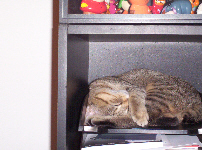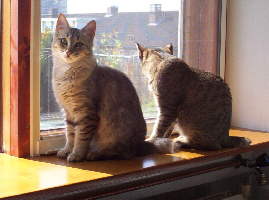 Afijn. Nu iets over de kittens. Ze zijn inmiddels zo’n 18 dagen oud (ik tel dus ook de dag van de geboorte mee (al werden ze pas s’avonds geboren). Ze wegen al meer dan 300 gram. Dit is naar mijn weten een boel. Dat wil niet zeggen dat ze daarmee ook uit zullen groeien tot reuzen, maar hun sterke botstructuur telt hier ook bij mee. De oogjes zijn echt goed open. Ze kunnen je nu goed aankijken. Ik kan al veel met ze doen. Ze vinden aaien heerlijk, spinnen al en moeders laat dit allemaal toe. Alleen als je ze optilt uit hun doos dan gaan ze piepen en schreeuwen en dan komt moeders aangesneld. De eerste week hebben de kittens en hun moeder bij ons op de slaapkamer geslapen. Dit om goed een oogje in het zeil te kunnen houden. Nu zijn ze verhuisd naar de woonkamer. Zo komen ze al snel in contct met de andere katten en zal moeders niet vervreemden van de groep. Moeders laat trouwens veel toe. De andere katten mogen gewoon een kijkje bij haar nemen. Major was zo brutaal om gewoon in de doos te springen en de kittens eens goed van dichtbij te bekijken en te besnuffelen. Nee, ik moet zeggen ik heb geen omkijken naar dit nestje. Het loopt allemaal vanzelf. Om de dag een schoon dekentje, moeders eten geven, kittens wegen en meer niet. Heerlijk.