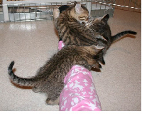 Weet nogmaals dat al mijn kittens een lang staartje hebben. Dit is niet de complete bobcat-look waar je op hoopt, maar ik zal nimmer de staartjes couperen (inkorten). Dit wordt bij vele fokkers wel gedaan (al zullen de meeste dit wel zeggen tegen toekomstige kopers). Verder hebben ze alle mooie eigenschappen wat je van een pixie-bob mag verwachten (bouw (twee zijn ook polydactyl), vacht met die prachtige spots en een mooi kopje). De reden dat fokkers hun staartje couperen, is omdat een langstaartje niet voldoet aan de standaard c.q. showkwaliteit. Met een gecoupeerd staartje mag je overigens ook niet showen. Maar waarom zou ik die staartjes (welke overigens heel mooi en stevig zijn) willen weghalen? Wie geeft mij dit recht? Daarnaast is het verboden in Nederland. Afijn pixie-bobs kunnen geboren worden met geen, kleine staartjes, middellange of lange staartjes. De 1e pixie is volgens de legende ontstaan uit een bobcat (korte staart) en een huis-/boederijkat (lange staart). Dus vanaf de 1e lijn bestaat de mogelijkheid al op lange en korte staartjes. Jammer genoeg zijn deze lange staartjes niet de standaard. Al zou ik vinden dat dit wel zo zou moeten zijn. Net als dat dit ras een korthaar en halflanghaar variant kent en gewoon aantal tenen en meertenigheid.