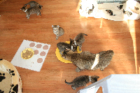 De kittens gaan nu lekker rondlopen in hun kamer. En dit gaat gepaard met vallen en opstaan. Nu wordt het pas echt leuk om naar ze te kijken. Wat ontdekken ze nu weer? Wat voor streken zullen ze uithalen? Ze zijn zo grappig. Kijk hoe kitten 6 over kitten 4 (Izzy) heen kruipt. Er omheen is toch echt makkelijker. Als ik binnenkom, stieren ze (alle 6) al miauwend op mij af en beklimmen mijn schoot, armen, benen en rug. Boefjes zijn het! Maar ik ben ook zo trots op mijn lieverds. Ik dacht dat Macy was afgevallen, maar het valt me reuze mee. Dus ook daar hoef ik me geen zorgen om te maken. Als ze straks allen de 500 gram hebben gepasseerd, krijgen ze hun 1e ontworming. Ik neem uiteraard Macy hierin mee. Met Mia gaat het ook beter. Ze wordt nog wel gepest, maar blijft desondanks lekker doorspelen. Ze is een prachtig meisje en ook zij is al een beetje aangekomen.