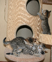 De reis is goed gegaan. Hij heeft wel gemauwd in de auto, maar ja naar 10 min. is hij lekker gaan liggen. Thuis wel vreemd alles natuurlijk. We (Frencis en Piet) hebben in de keuken een grote kast die met een kralen gordijn dicht is en daar heeft hij een plekje gevonden. We hebben hem er welke elke keer uitgehaald. In de avond heeft hij wat gespeeld en is hij in de krabpaal geweest. Dus dat ging wel wat beter. Hij heeft alleen heel de nacht gemauwd en om zijn moeder geroepen. Ik denk dat ik een paar uurtjes heb geslapen. Dit heb ik vanmiddag op de bank wel weer ingehaald. Maar vandaag is hij de kamer in geweest en heeft hij zijn plek je in deze krabpaal (zie foto) al gevonden (helemaal boven in). Dat zo’n klein ding daar al kan komen! Hij heeft alles al gedaan op zijn kattenbak dus dat gaat goed. Eten doet hij nog niet zo veel. Wel wat nat voer maar bijna geen brokjes. Verder is hij lekker speels en mag ik met hem kroelen. Bij Piet is hij wat voorzichtig maar ja dat komt ook nog wel. Ik heb nog twee foto's toegevoegd.